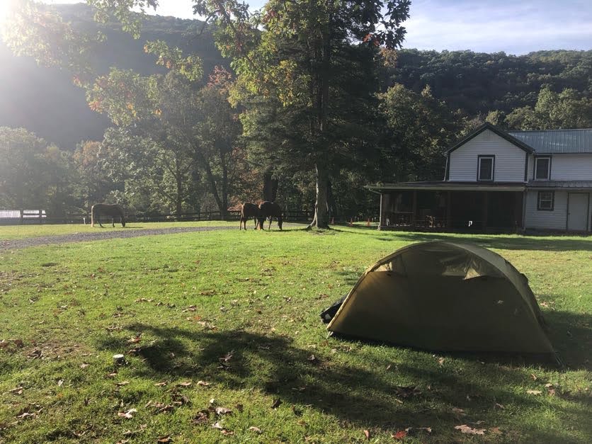 Two days ago, the trip had started out easy with a Thursday evening arrival at a horse stable campground via a shuttle service. Russ, our shuttle driver picked up two of our trio, myself and Sean, at the southern terminus of the trail. The plan was to bike back there to where our vehicle was, slightly downhill, along the 77-mile Greenbrier Trail in West Virginia over the next few days. The picturesque Greenbrier River in her fall dress would be our constant companion. We set up camp under the curious watch of the horses in their roped off areas.
